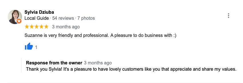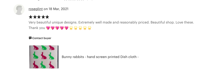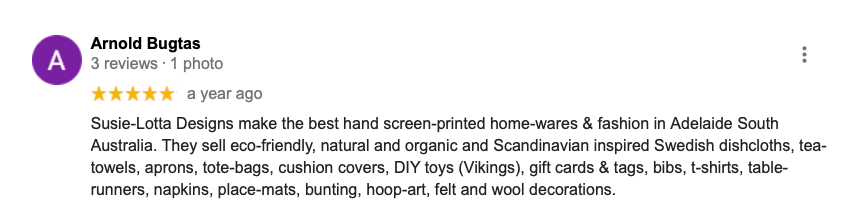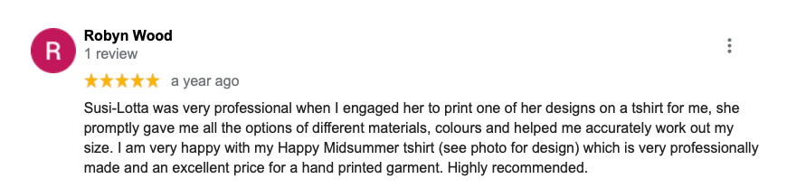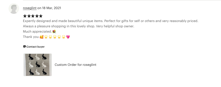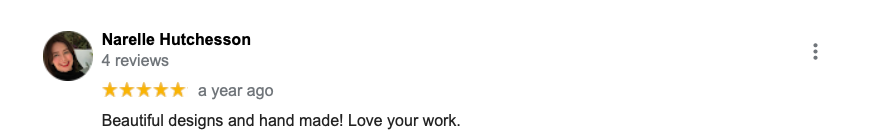 Reviews for Susie-Lotta Designs recieved on Google and Etsy.